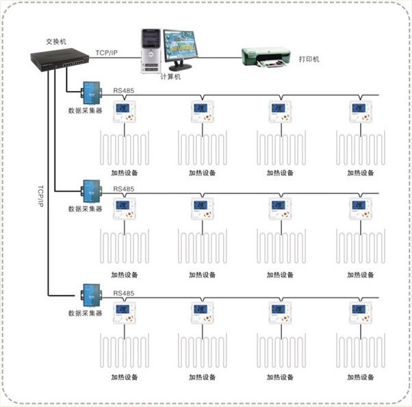軟件系統(tǒng)與采集器的通訊標準為TCP/IP通訊方式。采集器與采暖智能溫度控制器的通訊采用平衡傳輸?shù)腞S485串行總線通訊標準,通訊距離遠,抗干擾能力強。 其中,每—臺電采暖智能溫度控制器獨立完成電伴熱設備的各種狀態(tài)的數(shù)據(jù)采集和控制任務。上位機軟件系統(tǒng)以周期詢問的方式與數(shù)據(jù)采集器實現(xiàn)穩(wěn)定的網(wǎng)絡通訊,數(shù)據(jù)采集器將采集到智能溫度控制器的狀態(tài)上傳至上位機管理中心。上位機軟件系統(tǒng)又將采集到智能溫度控制器的實時狀態(tài)進行邏輯分析,并將 佳控制結果通過信號控制發(fā)送至智能溫度控制器, 終實現(xiàn)自動化控制。